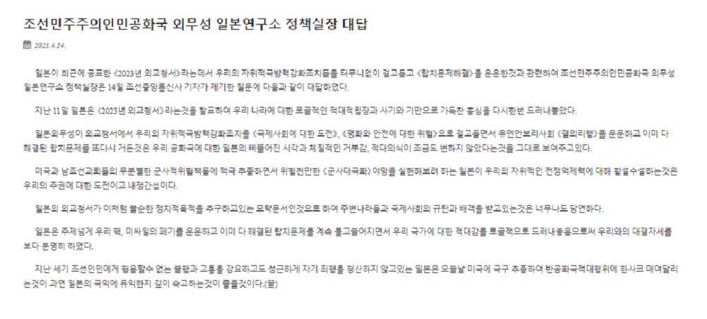 Na “carta azul diplomática de 2023”, publicada em 11 de abril, o Japão expôs novamente sua posição hostil à RPDC e sua maligna intenção carregada de fraudes e engano.